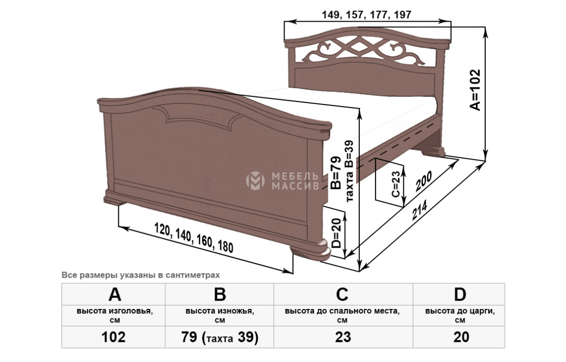 Благородная кровать Вирджиня сделана из качественного древесного массива. Изделие имеет изогнутое сплошное изножье и высокое изголовье с узором. Обе спинки плавно переходят в устойчивые ножки, которые защищают пол от повреждений. Купить эту прочную модель по выгодной цене можно в нашем интернет-магазине. Осуществляется доставка на дом по Йошкар-Оле и Республике Марий Эл.| Размер | Цена | |